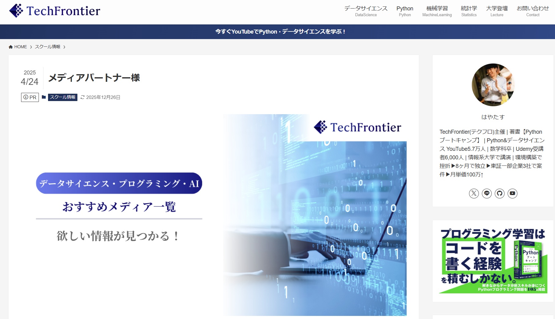 TechFrontierは、未経験から最短最速でキャリアアップを目指す「データサイエンティスト転職攻略講座」などを展開しているメディアさまです。